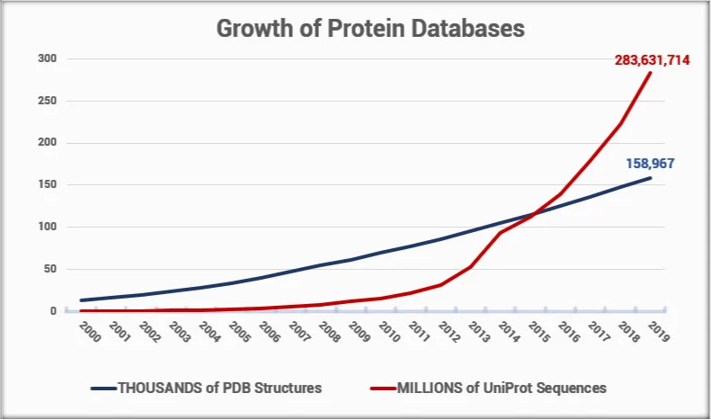 Yet, solving structures using experimental methods requires extremely specialized training, a high degree of skill, and a lot of luck. The cost of solving a new, unique structure is on the order of $100,000. Given the difficulty of solving an experimental structure, and considering the rate at which new protein sequences are discovered, it has become clear that with today’s technology, we will not solve structures for all the new proteins being identified and sequenced.