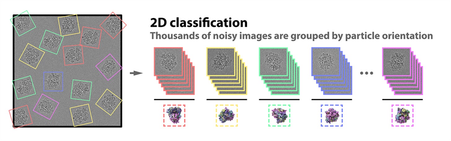 To improve this “signal-to-noise ratio,” we pick out the best 2D images of our proteins before computer software groups them together by orientation (up, down, sideways, and so on). We can now build a representative image — an average of all the 2D images at said orientation (a 2D class average) — for every orientation that has a much improved signal-to-noise ratio.