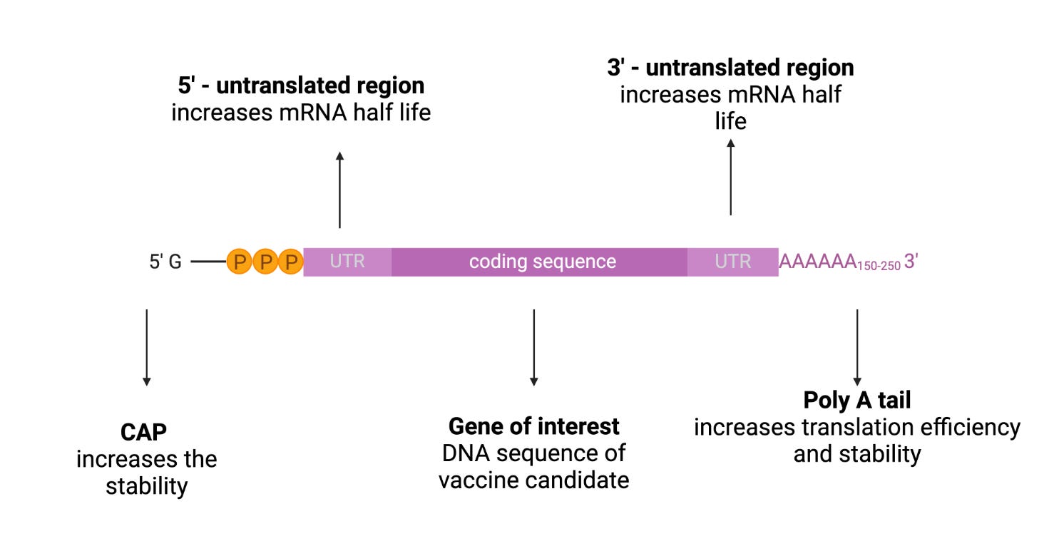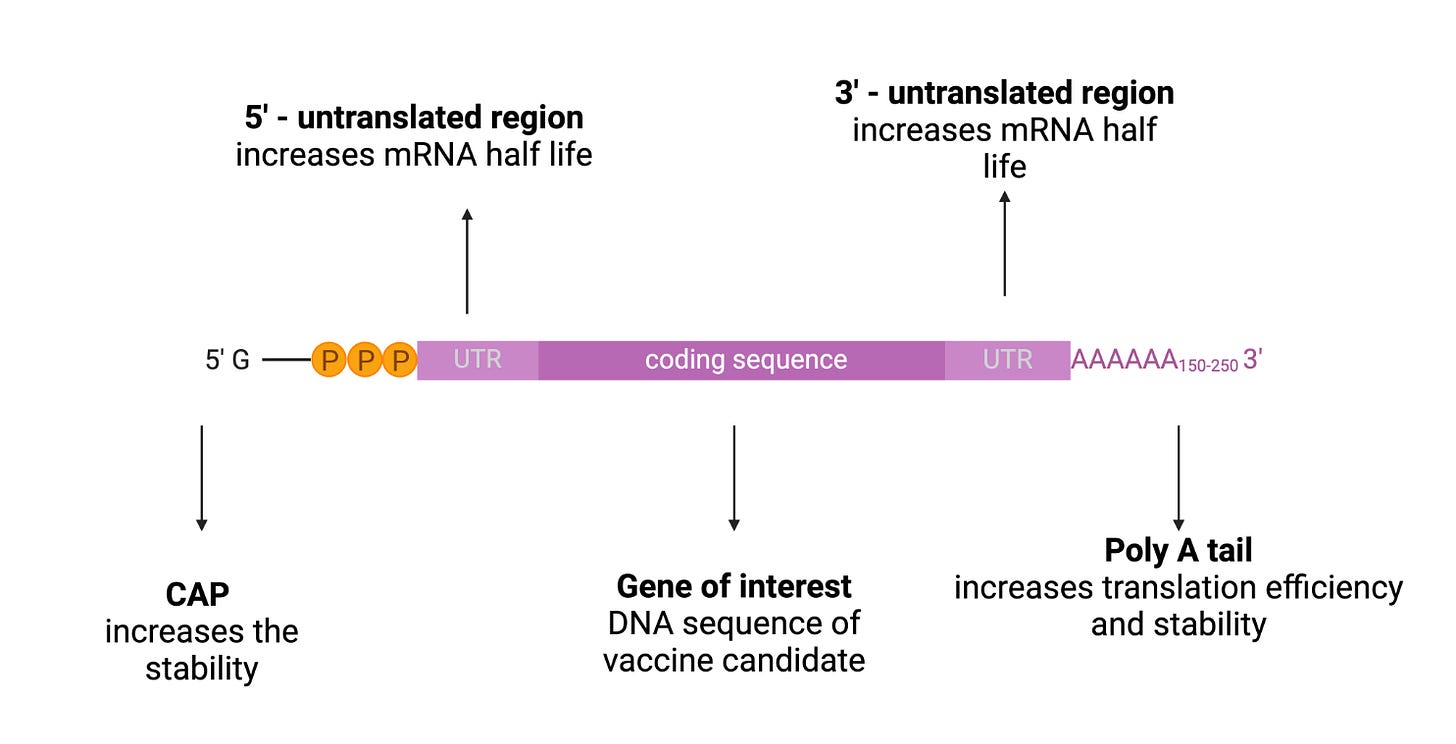 Although UTRs do not encode the desired antigen or a protein, they play a critical role in regulating mRNA expression and stability. These regions are situated between the ORF and the 5′ and 3′ ends (17). They also facilitate mRNA recognition by ribosomes and contribute to post-transcriptional modification of mRNA (64). Inclusion of naturally occurring sequences, such as those derived from alpha- and beta-globins, have been widely used to design mRNA constructs for vaccines (65-66). For example, Zeng et al. developed de novo 5′ UTR sequences based on the guanine–cytosine content and length for mRNA vaccine development. (17)(67).