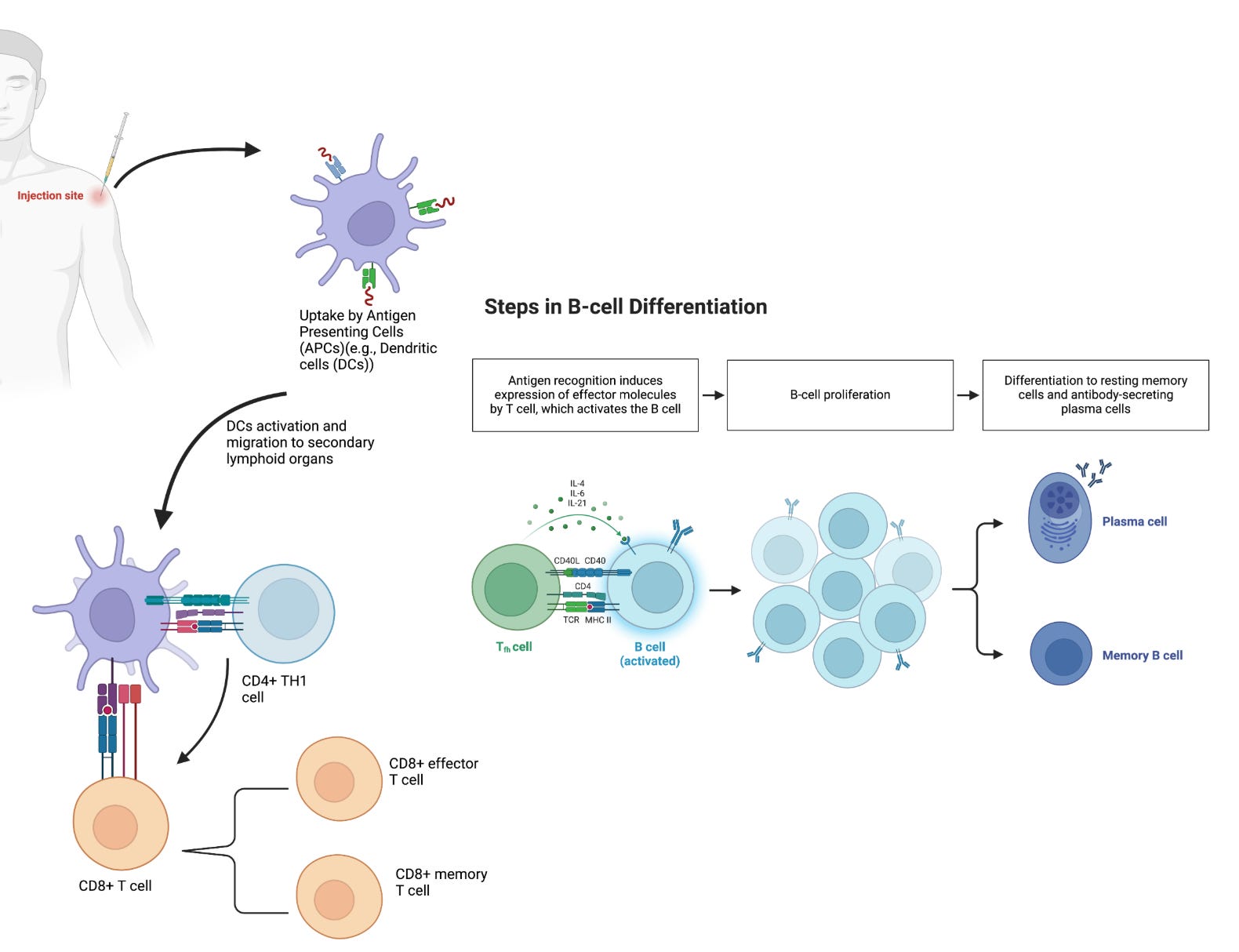 B cells are also able to recognize and respond to vaccine antigens before T cells are engaged. Following vaccine administration, B cells detect and internalize antigens, and upon PRR activation, differentiate into plasmablasts, short-lived antibody-secreting cells, that produce the initial wave of antibodies.