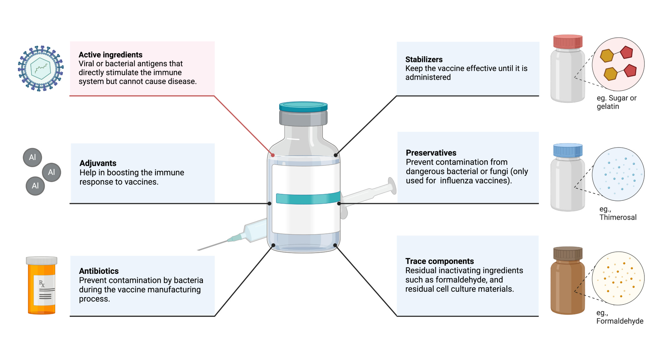 The most important component of vaccines are one or more protein antigens, either directly derived from the pathogen of interest or biomanufactured (15). Polysaccharide antigens also exist and can also induce protective immune responses. They have been the basis of vaccines like pneumonia and meningitis caused by Streptococcus pneumoniae (29). These antigens are responsible for inducing immune responses that provide protection. Other vaccine components may include preservatives (eg. thimerosal, phenol, formaldehyde) to prevent contamination by bacteria or fungi; stabilizers (eg. gelatin, lactose, sorbitol) to keep the vaccine potent during transportation and storage, especially under temperature variations; and excipients (eg. aluminum salts) to ensure vaccine consistency and efficacy (15). Adjuvants are often added to increase potency, reduce the dose of vaccine which must be administered, and increase efficacy in some populations (e.g., infants, elderly, and immunocompromised individuals)(30)(Figure 2).