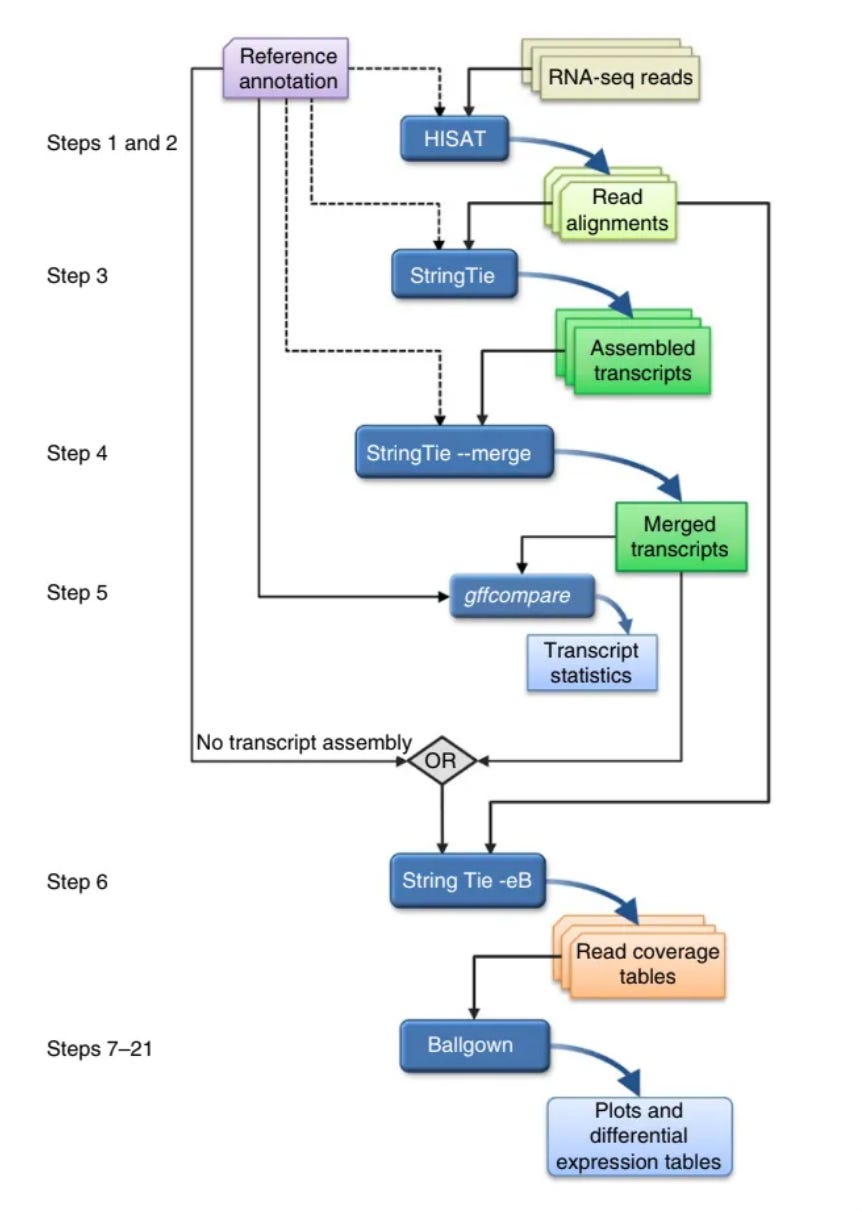 Ballgown takes all the transcripts and abundances from StringTie, groups them by experimental condition and determines which genes and transcripts are differentially expressed between conditions.
