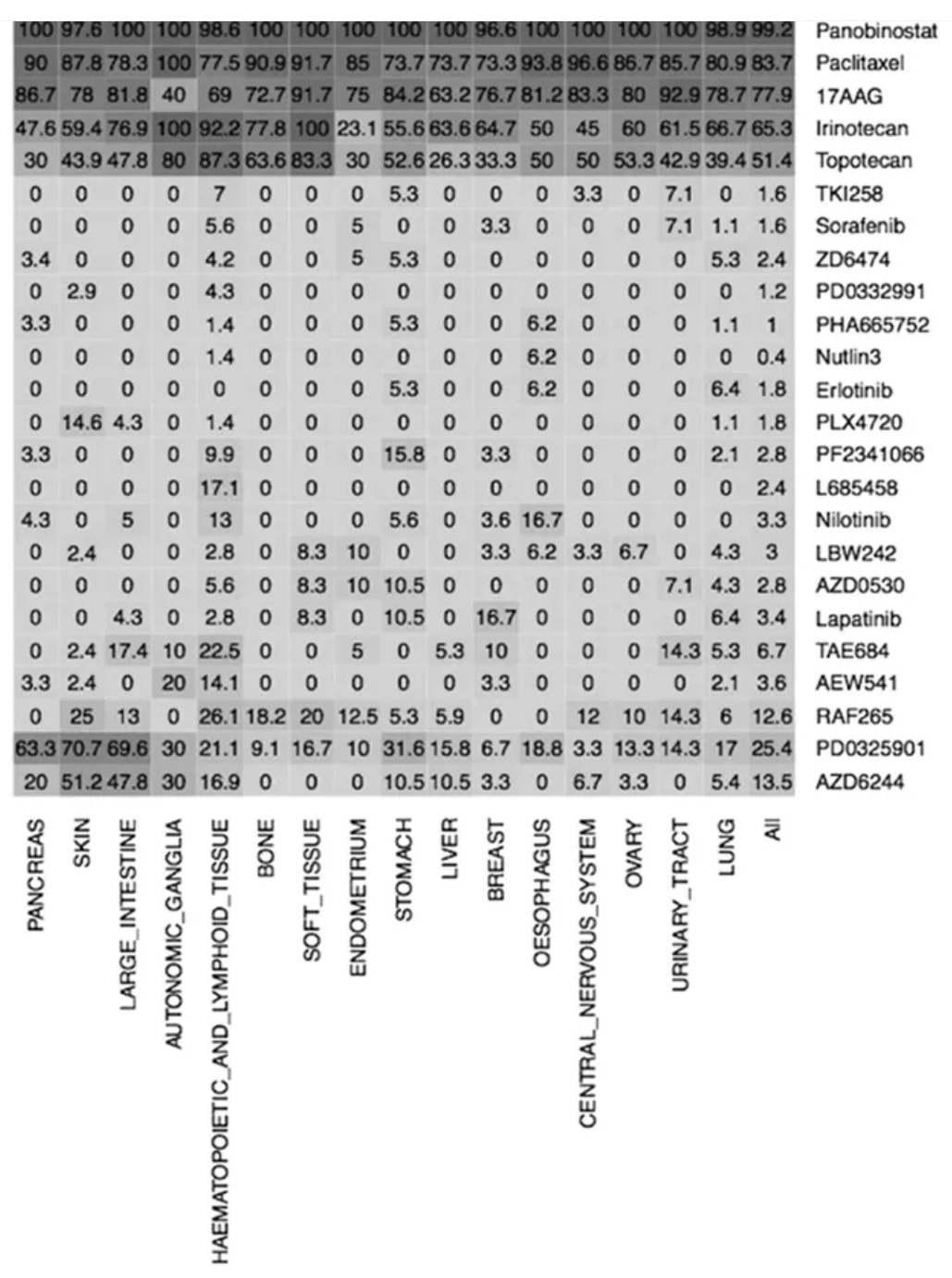 In their study, they concluded that only a few drugs — Panobinostat, Paclitaxel, Irinotecan, 17AAG, Topotecan — were effective against more than 50% of the cell lines with Panobinostat and Paclitaxel being the most impressive. Panobinostat was observed to be effective against more than 99% cell lines while Paclitaxel was effective against 83% cell lines while also being effective against 100% of the cell lines belonging to Autonomic Ganglia tissue.
