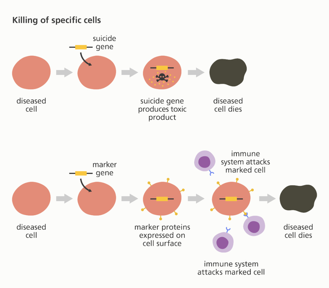 The aim is to insert DNA into a diseased cell that causes that cell to die. This technique is suitable for diseases such as cancer that can be treated by destroying certain groups of cells.